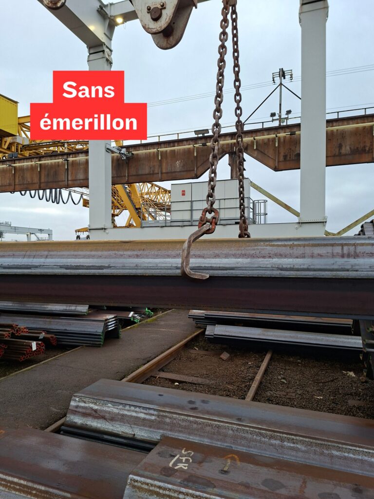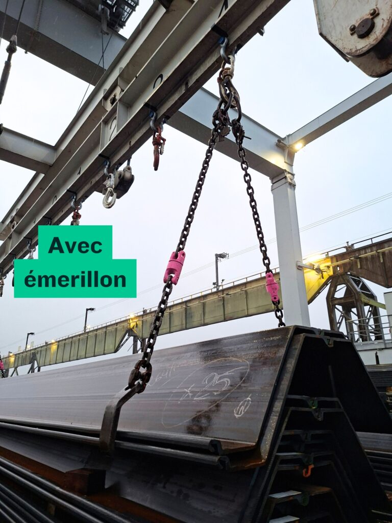 ❓Problème lors de la manutention de certaines palplanches dont la zone de support est fine. Une fois la charge sous tension, le crochet avait tendance à se mettre de travers, la chaîne s’enroulant sur elle-même.